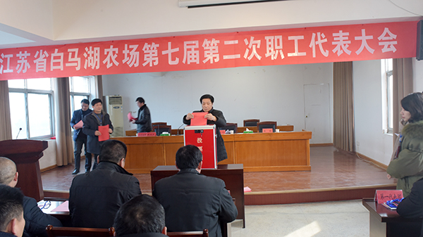 在大會預備會議通報參會人數、通過大會議程后,大會在莊嚴的國歌聲中宣告開幕,黨委書記、場長姚春華作了《關于江蘇省國營白馬湖農場公司制改革方案的說明》,明確了改革的目的和在國有資產處置、法人治理結構、組織領導、進度安排等方面的具體要求和措施,有效地提高了代表們對農場公司制改革的認識和認同。接著,大會又以舉手表決的形式,通過了職工董事、職工監事選舉辦法,還按照規定程序和選舉辦法,分別通過票決、投票選舉和職工代表分別簽字等形式,順利通過了《關于江蘇省國營白馬湖農場公司制改革方案的決議》,選舉產生了一名職工董事和一名職工監事。黨委副書記韓正光宣讀了大會決議,宣告農場公司制改革方案順利獲得通過。