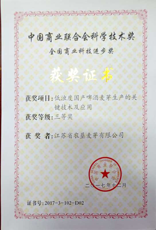 大會同時發(fā)布了2016年和2017年中國商業(yè)聯(lián)合會科學(xué)技術(shù)獎、服務(wù)業(yè)科技創(chuàng)新評獎結(jié)果,以及2017年全國商業(yè)質(zhì)量獎、零售企業(yè)服務(wù)質(zhì)量獎五星級單位。蘇墾麥芽公司《低濁度國產(chǎn)啤酒麥芽生產(chǎn)的關(guān)鍵技術(shù)及應(yīng)用》獲得全國商業(yè)科技進步獎三等獎。
