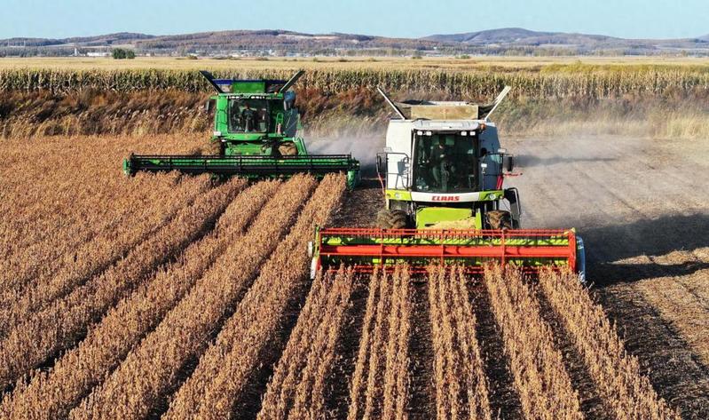 北大荒集團(tuán)黑龍江八五六農(nóng)場(chǎng)有限公司的農(nóng)機(jī)在進(jìn)行大豆收獲作業(yè)。(新華社發(fā) 王金彬 攝)